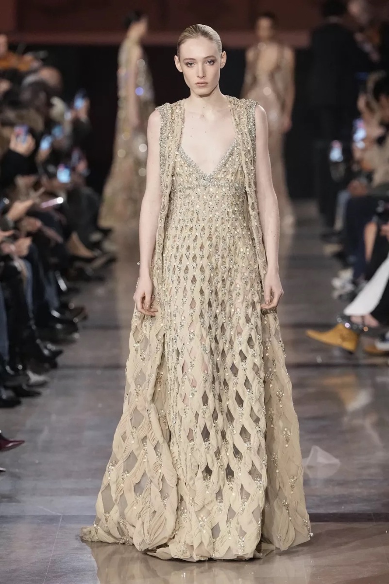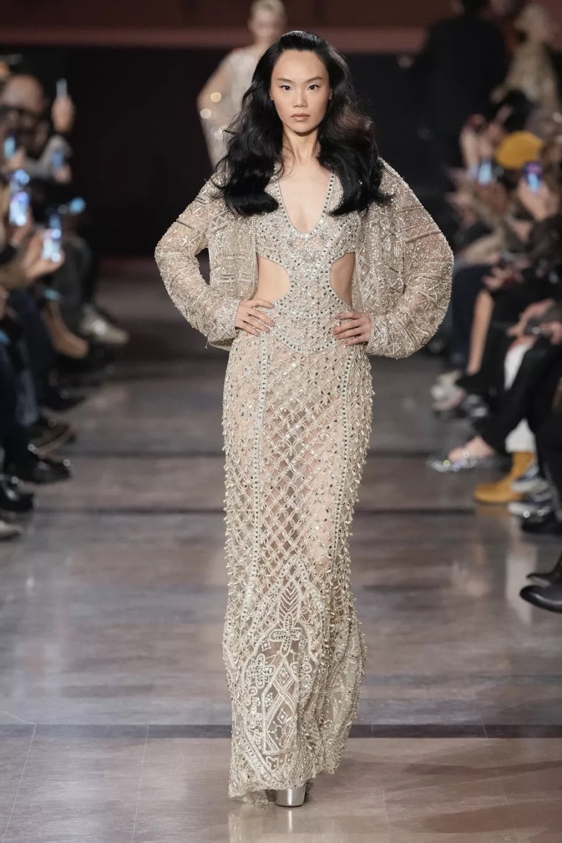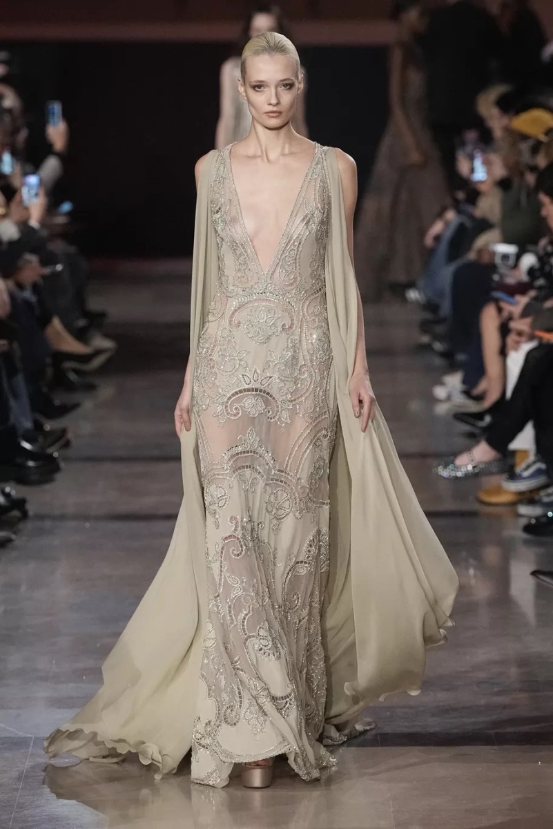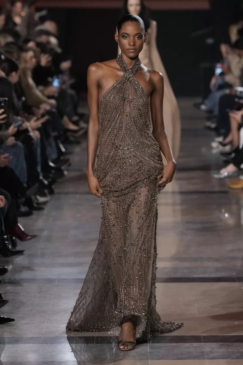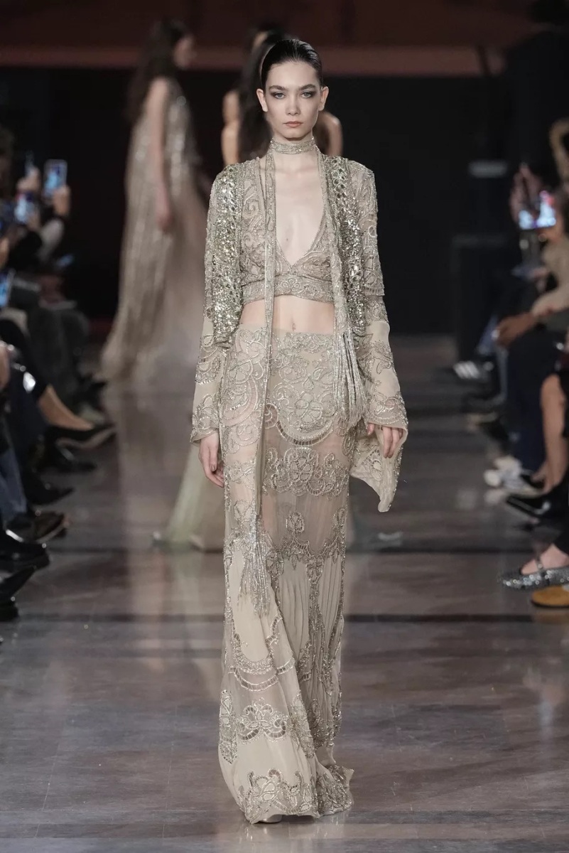 Chez Elie Saab, la broderie n’est jamais décorative. Elle structure le regard. Pour cette saison, elle capte la lumière, la fragmente, la diffuse. Cristaux, fils métallisés et ornements précieux s’intègrent aux matières comme des reflets naturels, évoquant les nuits chaudes, les fêtes qui s’étirent, les corps qui dansent.