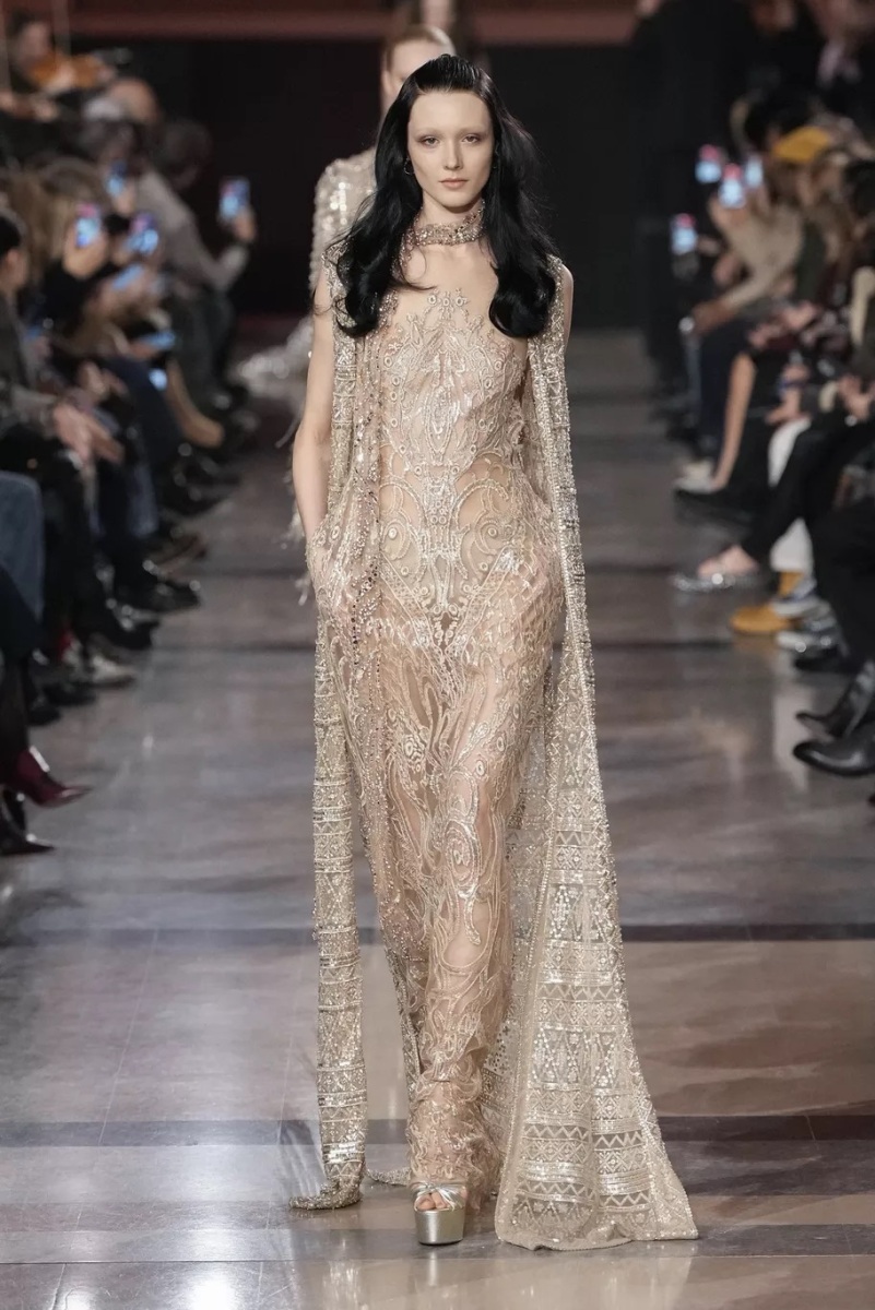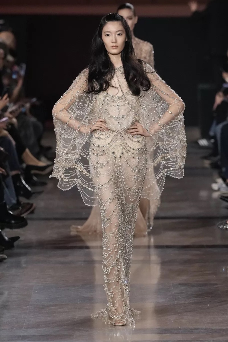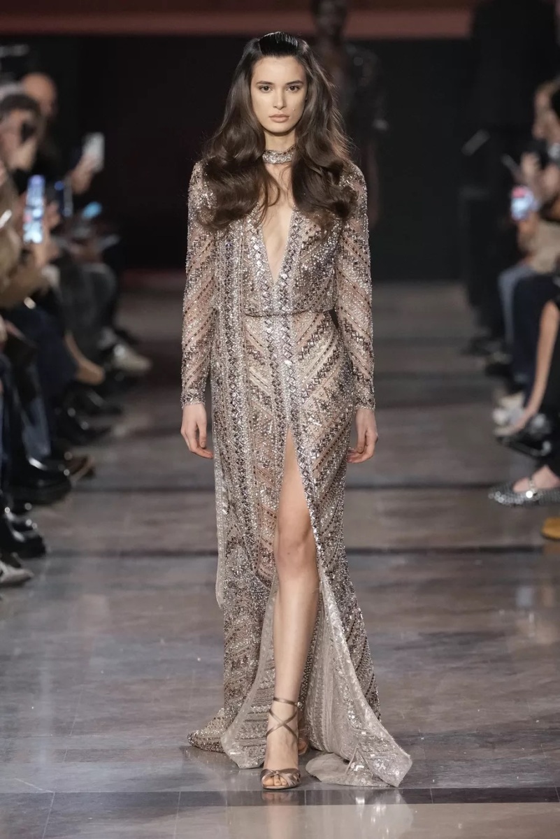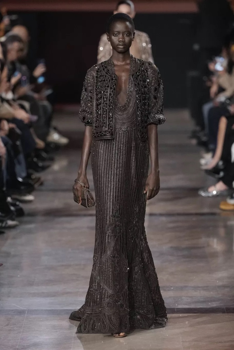 Chez Elie Saab, la broderie n’est jamais décorative. Elle structure le regard. Pour cette saison, elle capte la lumière, la fragmente, la diffuse. Cristaux, fils métallisés et ornements précieux s’intègrent aux matières comme des reflets naturels, évoquant les nuits chaudes, les fêtes qui s’étirent, les corps qui dansent.