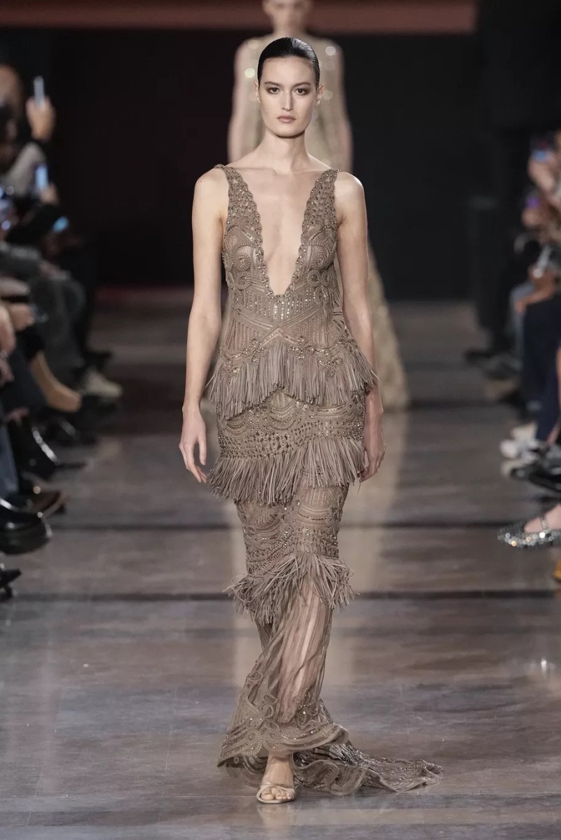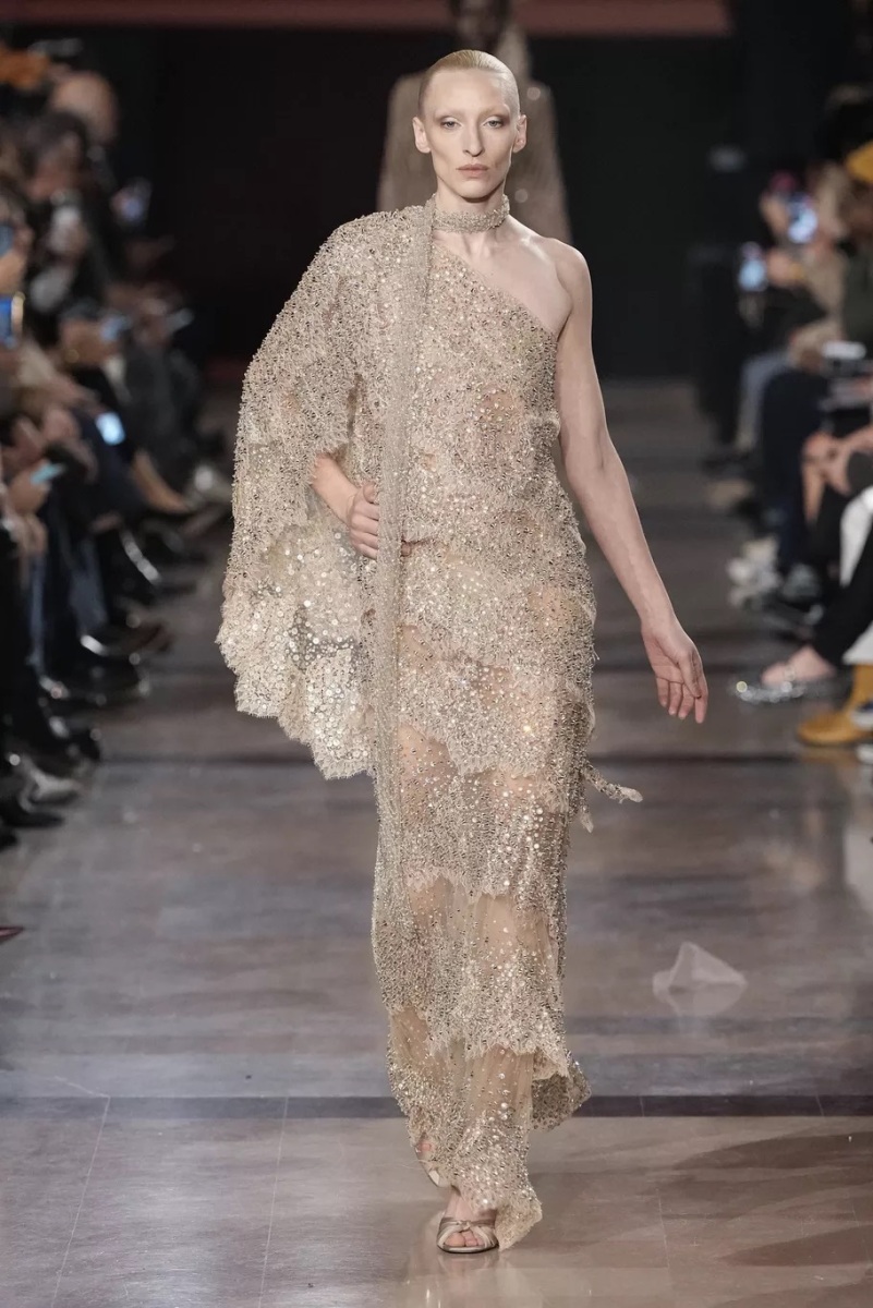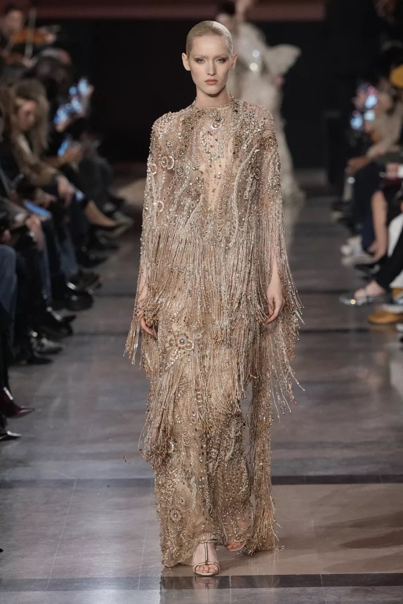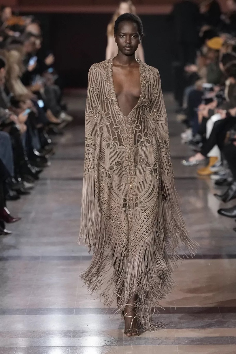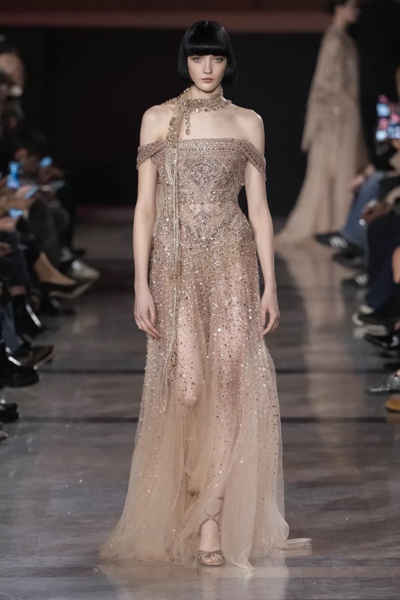 Chez Elie Saab, la broderie n’est jamais décorative. Elle structure le regard. Pour cette saison, elle capte la lumière, la fragmente, la diffuse. Cristaux, fils métallisés et ornements précieux s’intègrent aux matières comme des reflets naturels, évoquant les nuits chaudes, les fêtes qui s’étirent, les corps qui dansent.