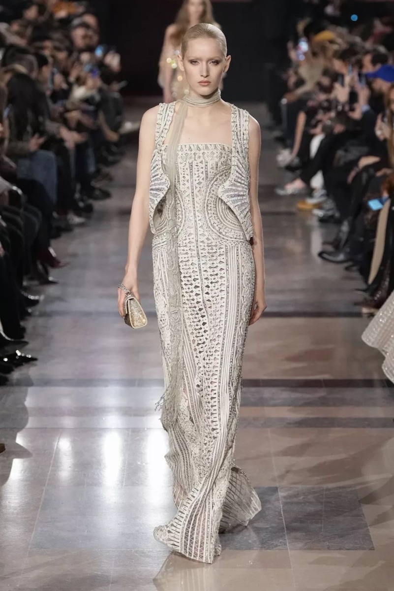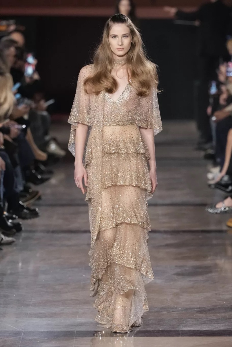 Plutôt que de s’attacher à une relecture littérale d’une décennie, Elie Saab en retient l’esprit : une certaine insouciance, une liberté de ton, une élégance assumée. La couture devient ici un langage d’allure. Elle ne cherche pas l’effet spectaculaire, mais une présence, une attitude.