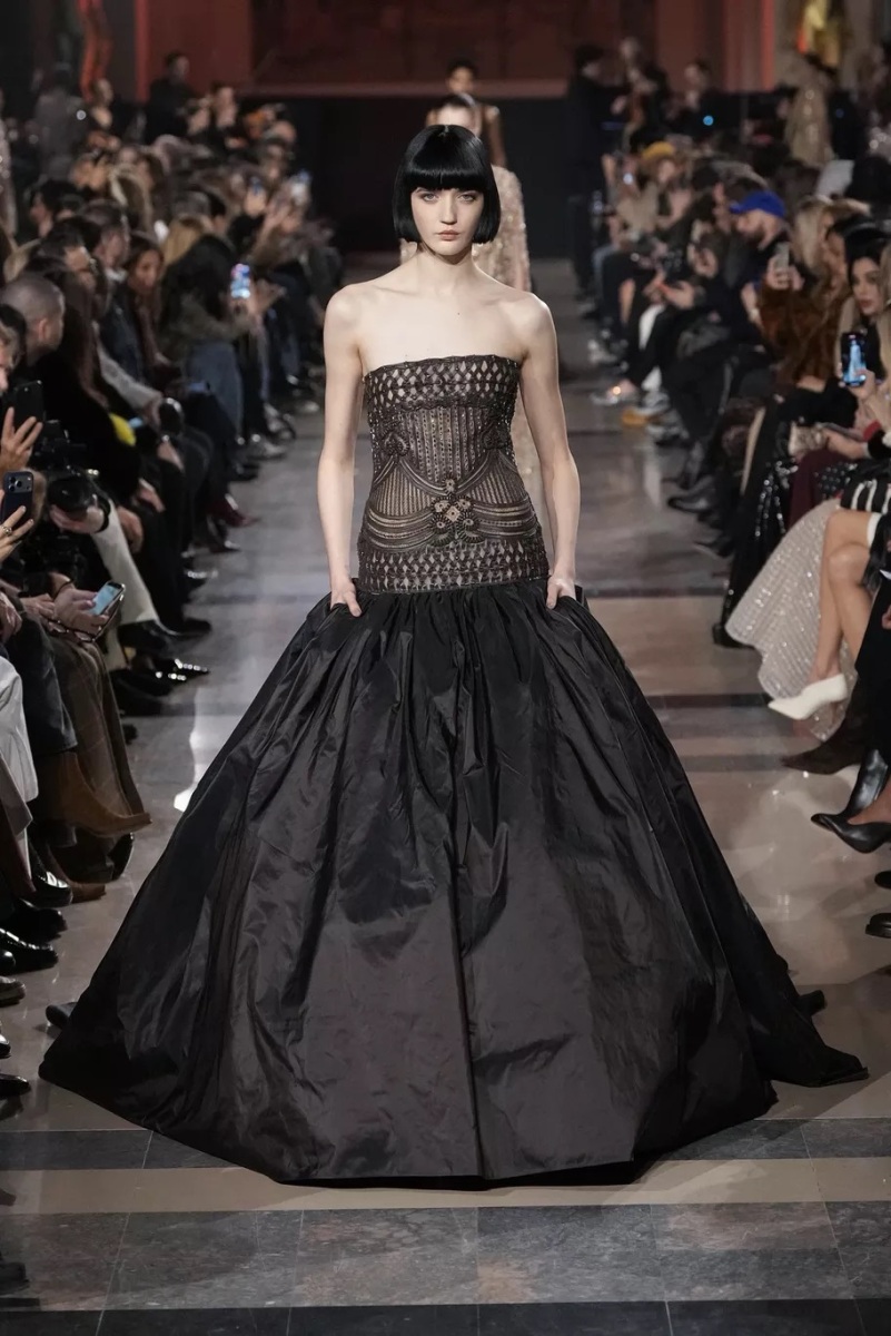 Les jeux de transparence, signatures récurrentes de la Maison, sont ici utilisés avec retenue. Ils suggèrent plus qu’ils ne dévoilent, laissant au mouvement et à la lumière le soin de dessiner la silhouette.