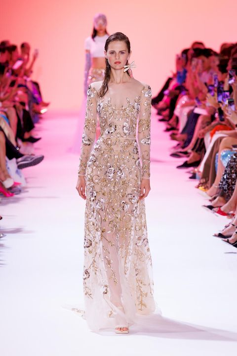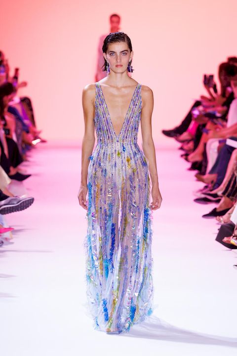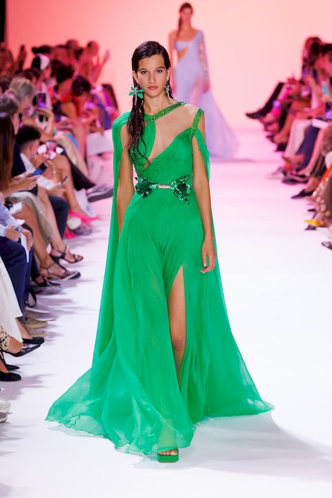 Le savoir-faire exceptionnel des ateliers de Georges Hobeika s’est révélé dans le choix raffiné des matières. La soie, le satin duchesse, l’organza, la mousseline de crêpe et la georgette ont été utilisés avec maestria pour créer des vêtements à la fois luxueux et légers. Les ornements sophistiqués, tels que les cascades de cristaux, les plumes et les perles, ont ajouté une dimension de pure élégance. Les tissages de velours se sont mêlés à des tourbillons de pétales irisés, créant des motifs floraux et botaniques qui ont fleuri sur les broderies délicates. L’ensemble était couronné par de gracieux vols de libellules, témoignant de l’engagement de la maison envers la nature vivante et en mouvement.