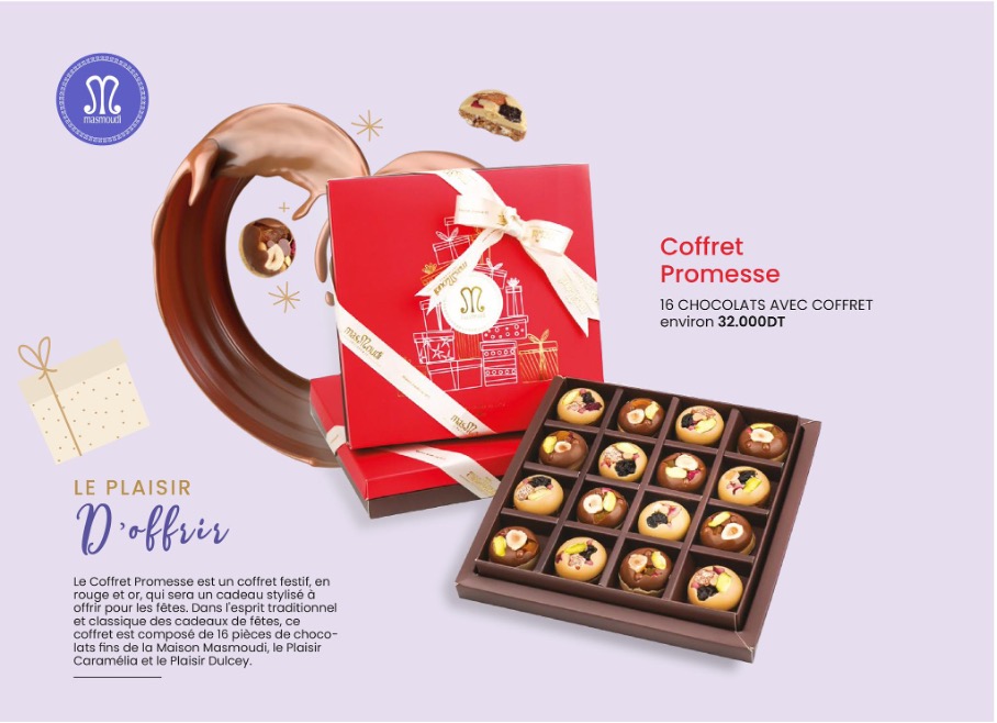 Peut-on imaginer une fin d’année sans chocolat? La réponse est clairement non, et chez Masmoudi, les gâteries continuent en chocolat.  Plein de nouveautés vous attendent : les boules pralinées, les fleurs framboises, les cubes caramel à la fleur de sel viennent s’ajouter aux cubes chocolatés et les incontournables tels que les truffes.