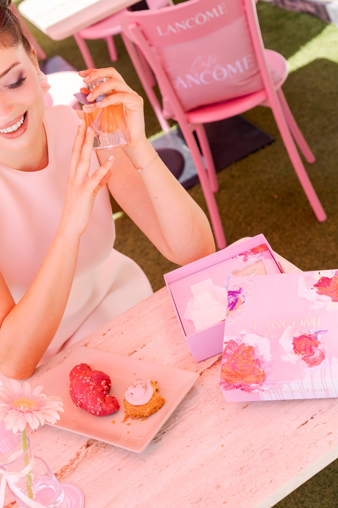 Dès que l’on pousse les portes de cette pâtisserie métamorphosée, on est instantanément transporté dans un univers féérique. Imaginez des parasols poudrés, des compositions florales d’une délicatesse exquise, les effluves des parfums iconiques de Lancôme qui se mêlent aux arômes sucrés. L’ambiance est résolument chaleureuse, féminine, et on se sent tout de suite enveloppé dans un cocon de douceur. C’est comme pénétrer dans un rêve où le rose est roi, et où chaque détail a été pensé pour ravir les sens.