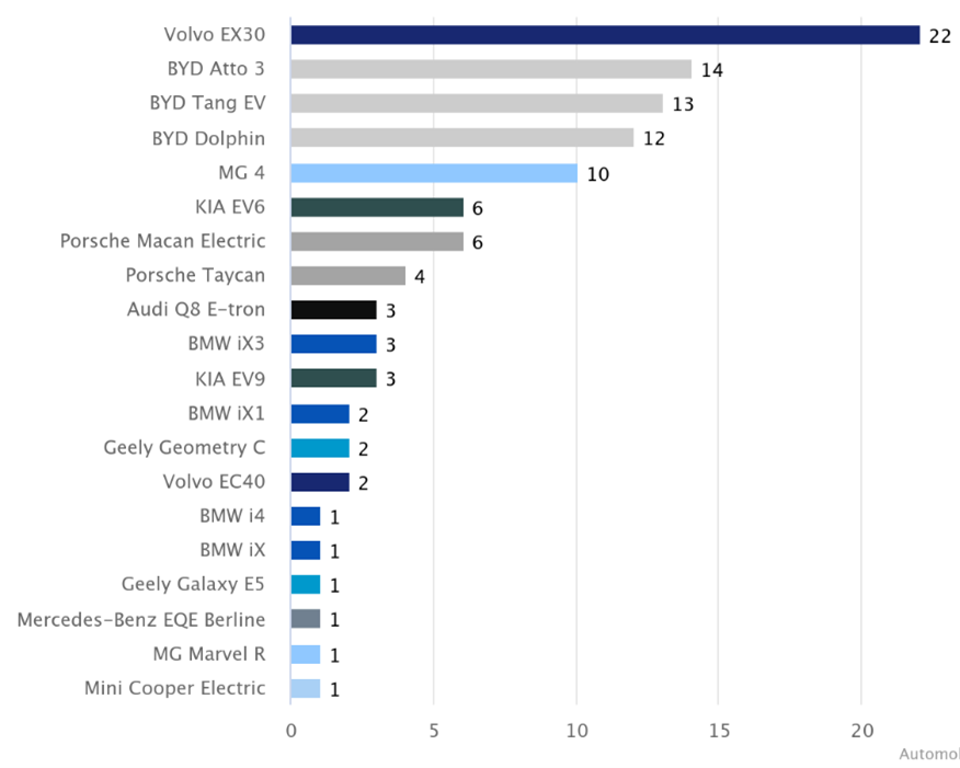 Volvo maintient son titre de « Voiture électrique la plus vendue en Tunisie » obtenue l’année dernière en continuant d’occuper la première place en 2025 arrêté à fin avril en se référant aux données statistiques d’immatriculation officielles. Le fameux EX30 continue sa domination puisqu’il écrase son propre record de vente enregistré au mois de décembre 2024 (12unités) avec 13 unités de voitures électriques immatriculées au mois d’avril 2025.